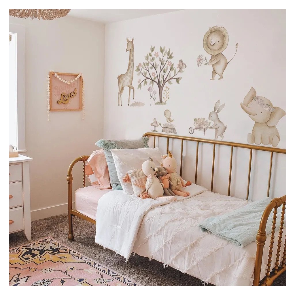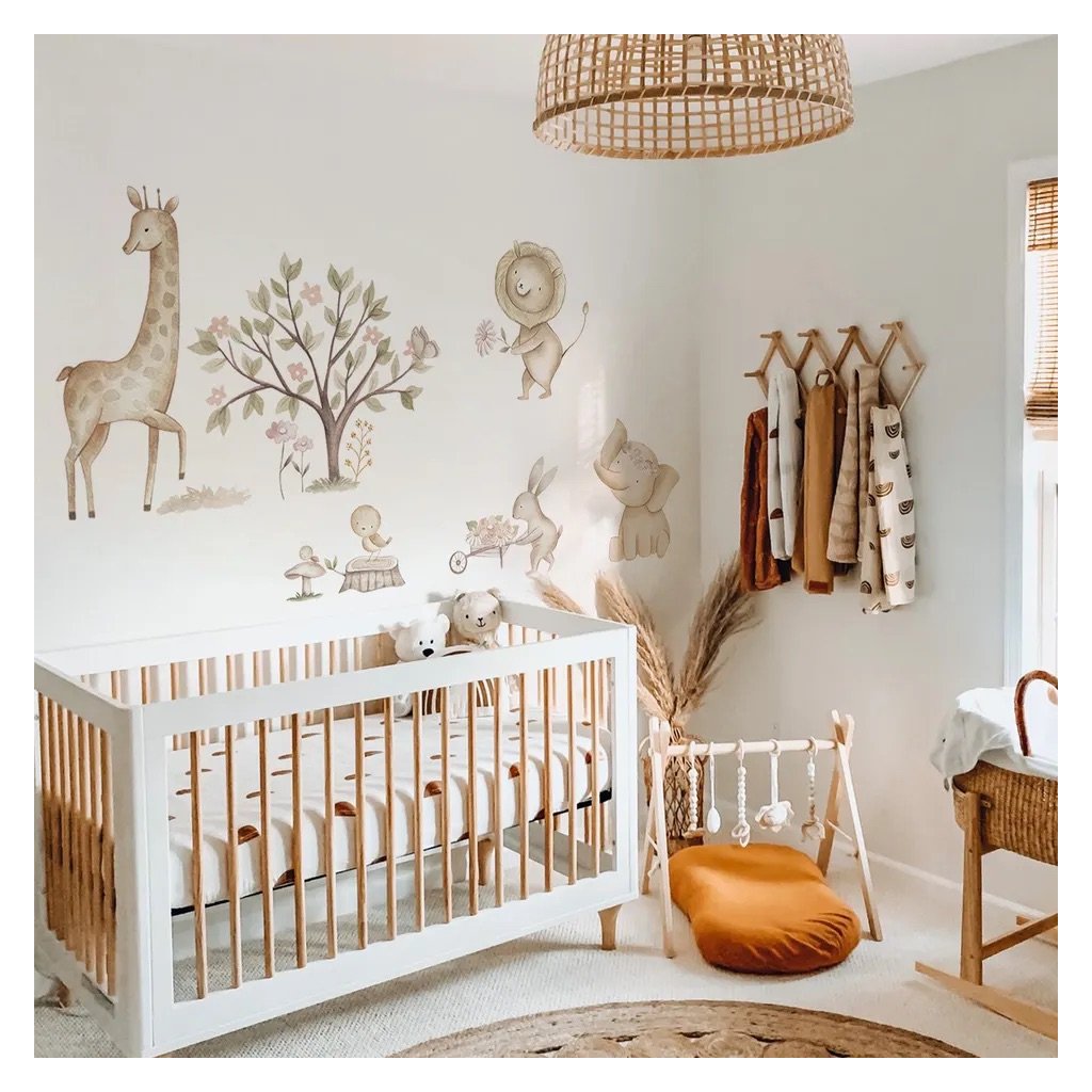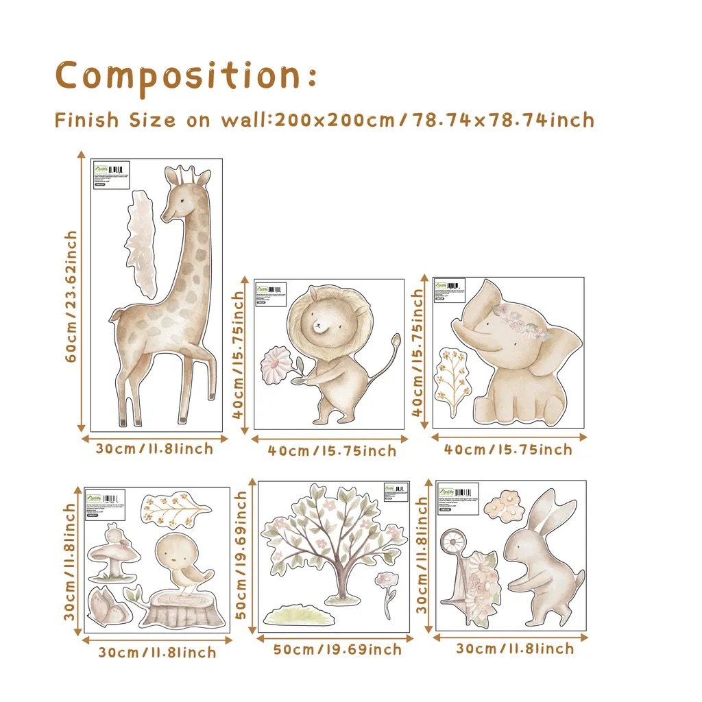 - Opakowanie zawiera zestaw naklejek o różnych rozmiarach, rozmiar po naklejeniu wynosi około 200 x 200 cm, żyrafa ma wymiary 60 x 30 cm, wielkość poszczególnych elementów widać na zdjęciach
