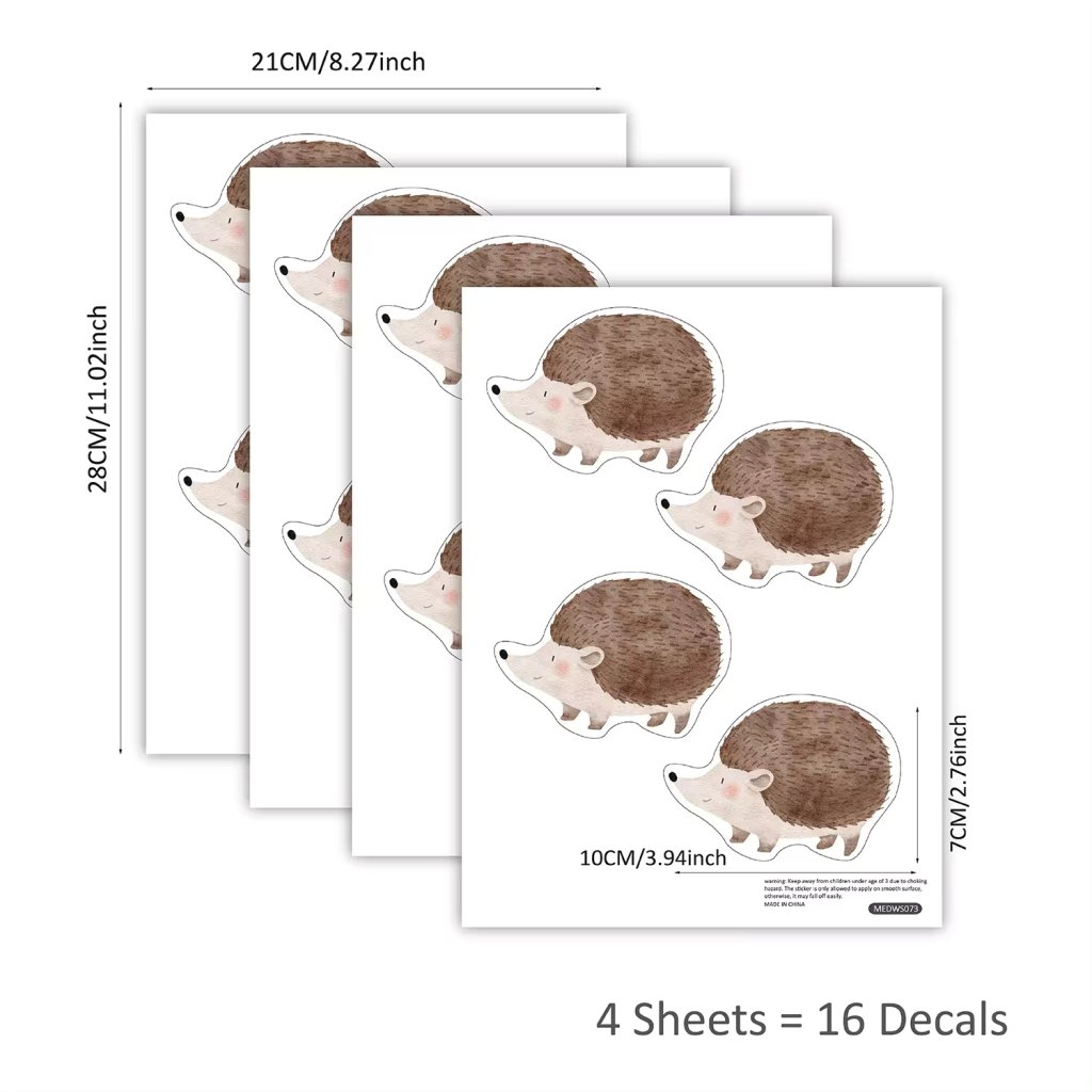 - Opakowanie zawiera zestaw 16 naklejek na 4 arkuszach, wymiar jednego jeża to 10 x 7 cm