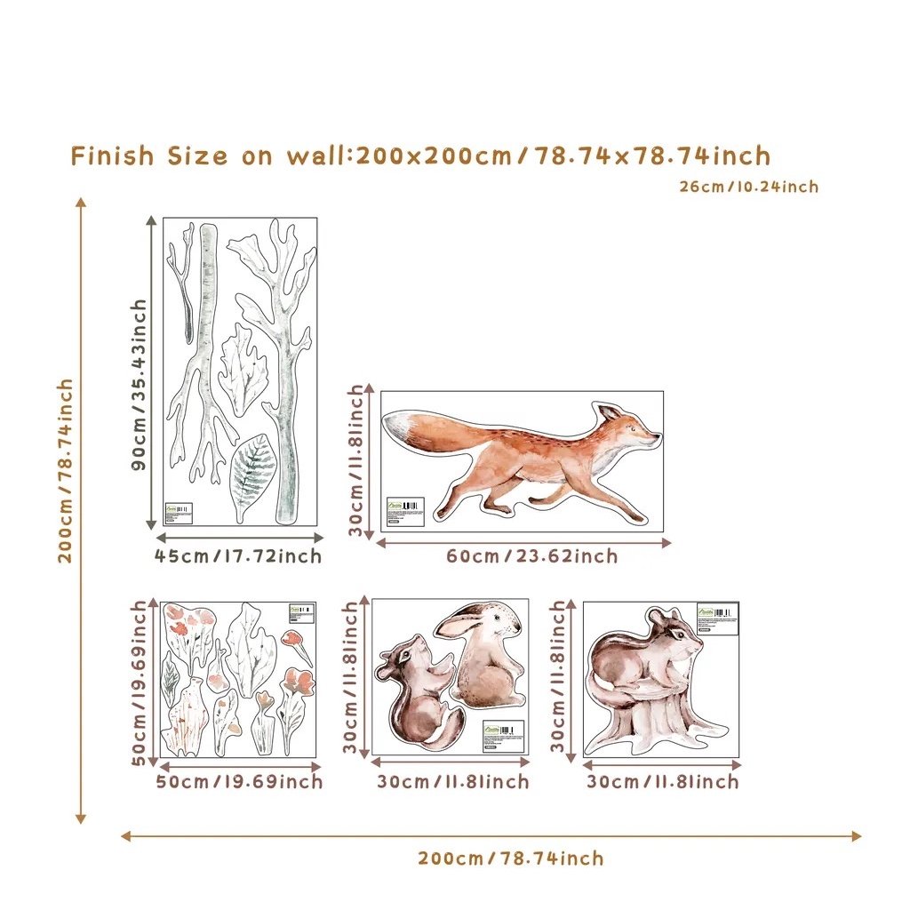 - Opakowanie zawiera zestaw naklejek o różnych rozmiarach, rozmiar po naklejeniu wynosi około 200 x 200 cm, wielkość poszczególnych elementów widać na zdjęciach