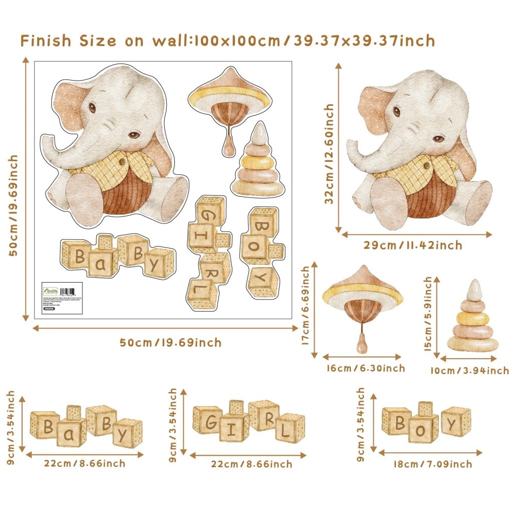 - Rozmiar wynikowy po naklejeniu wynosi około 100 x 100 cm, wielkość słonia to 32 x 29 cm