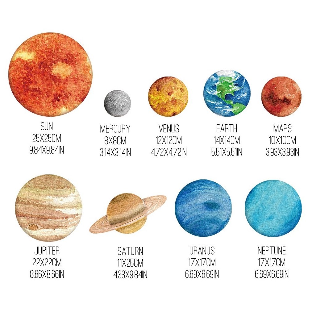 - Opakowanie zawiera 9 naklejek z planetami - wielkość planet mieści się w przedziale 30-8 cm