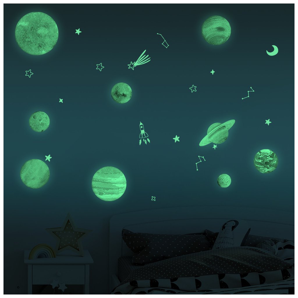 Dzięki świecącym naklejkom ściany w pokoju dziecięcym nocą zamieniają się w magiczne gwiaździste niebo.