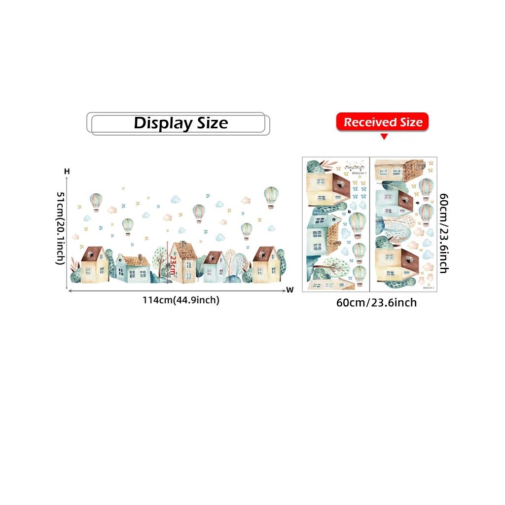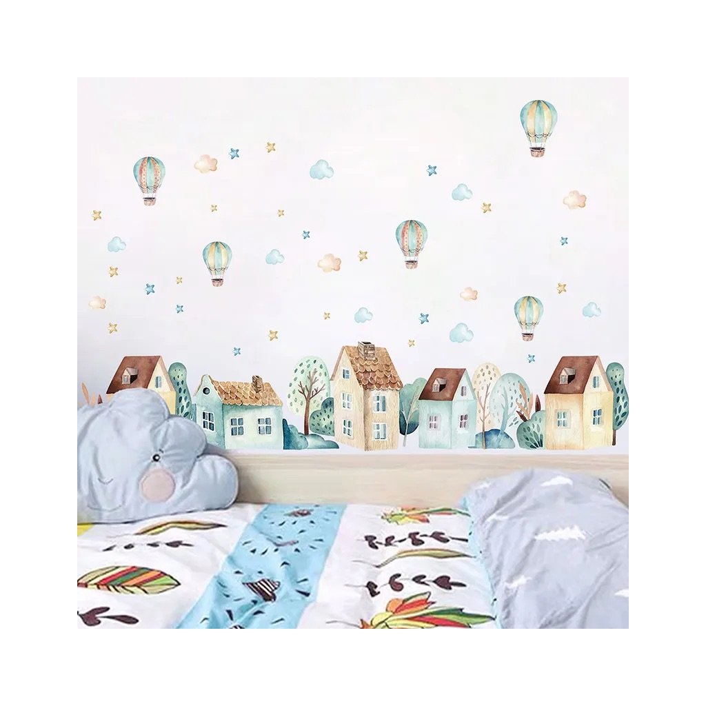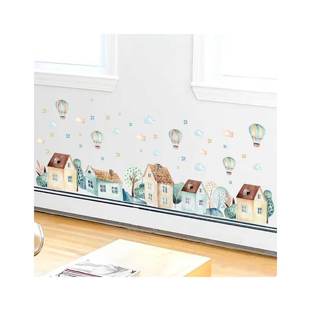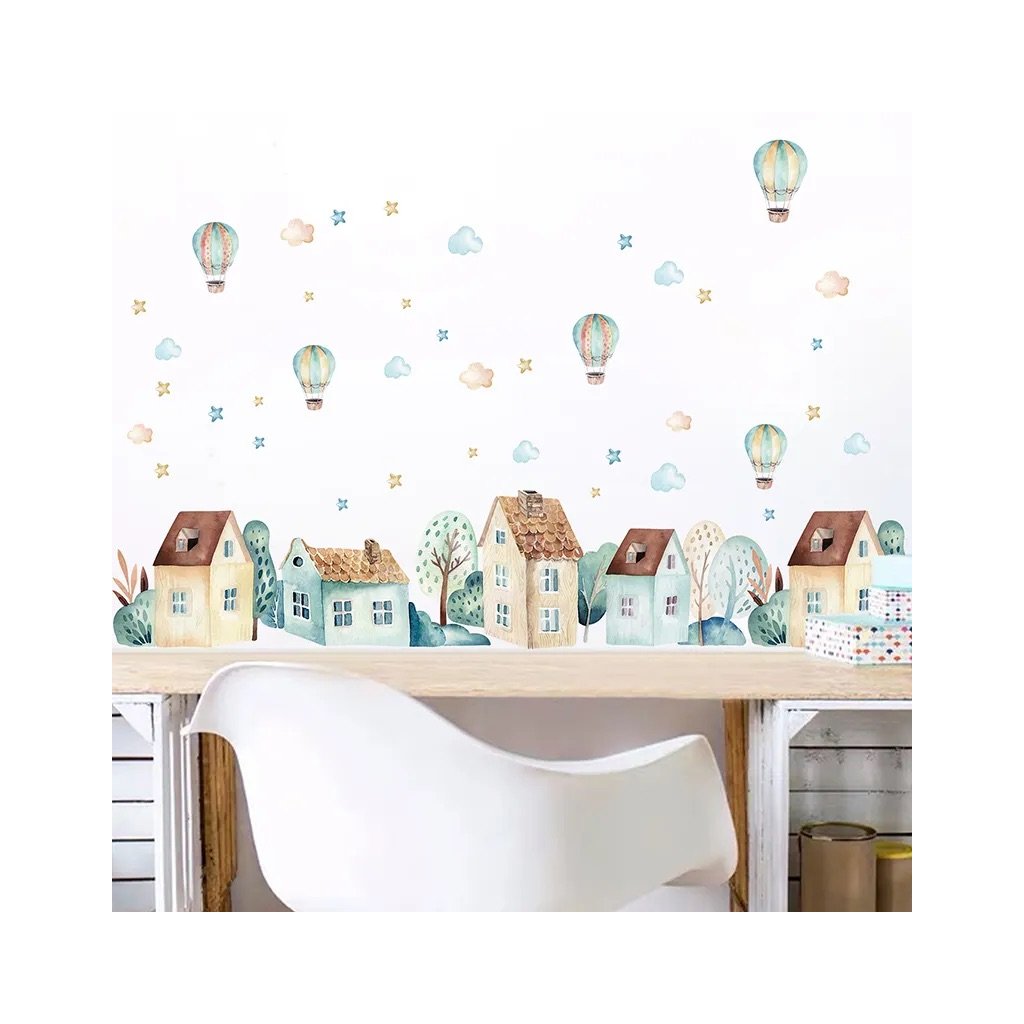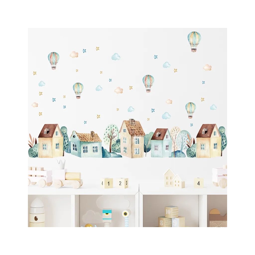 Piękna naklejka z domami, balonami, chmurkami i gwiazdami.