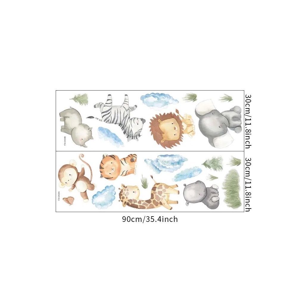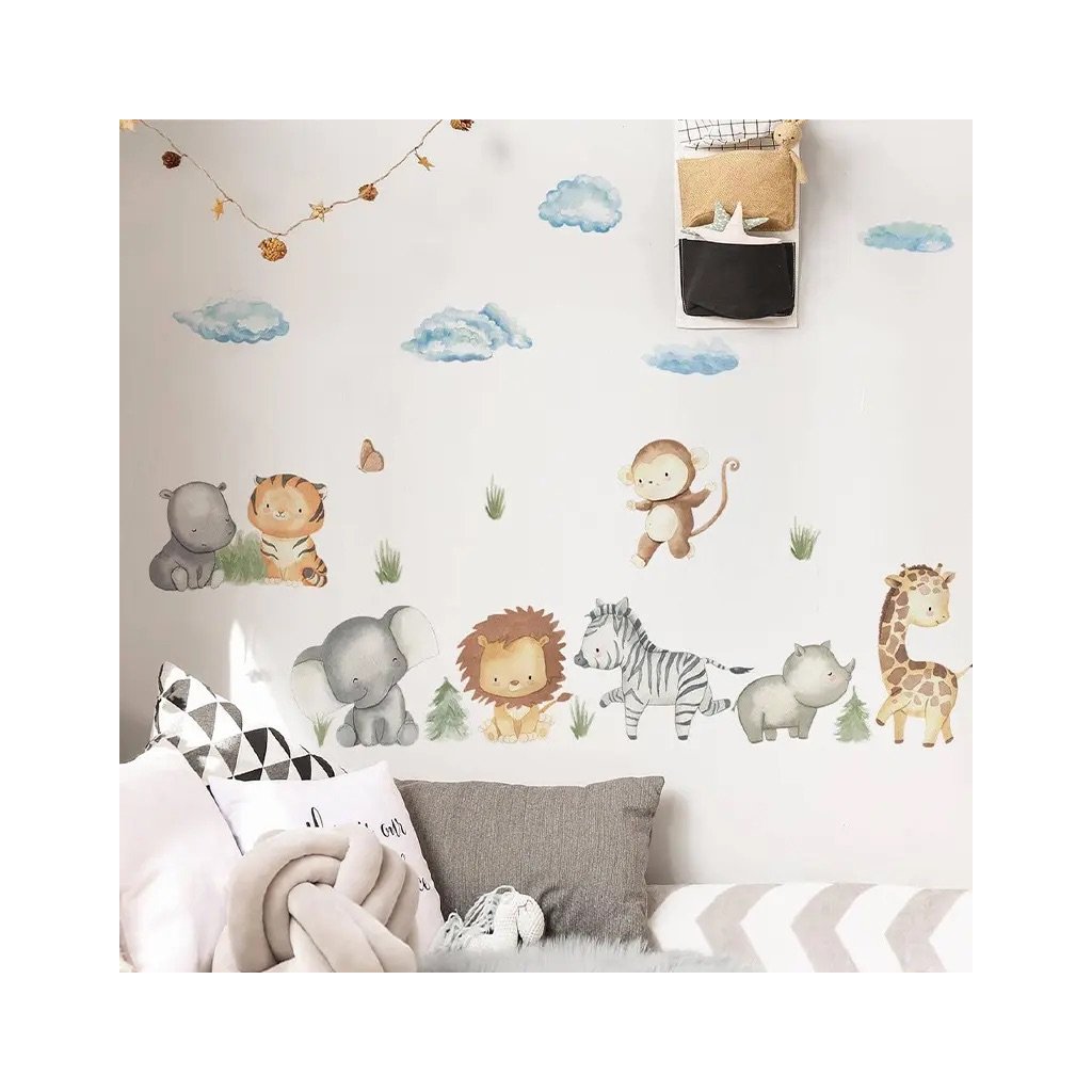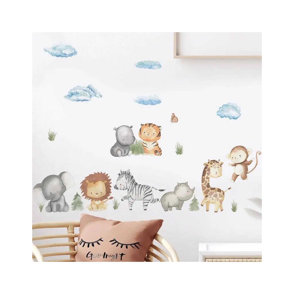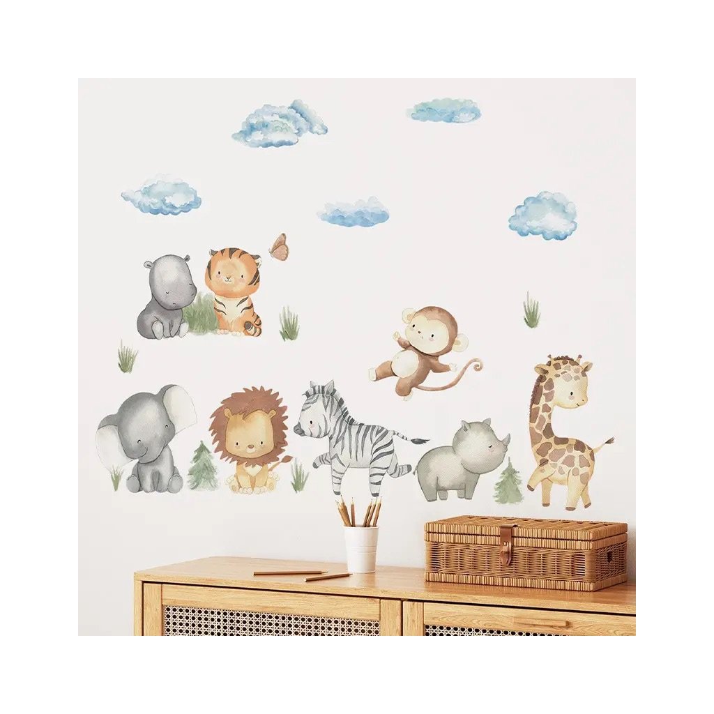 Naklejki z motywem safari - słoń, lew, zebra, nosorożec, żyrafa, małpa, hipopotam i tygrys.