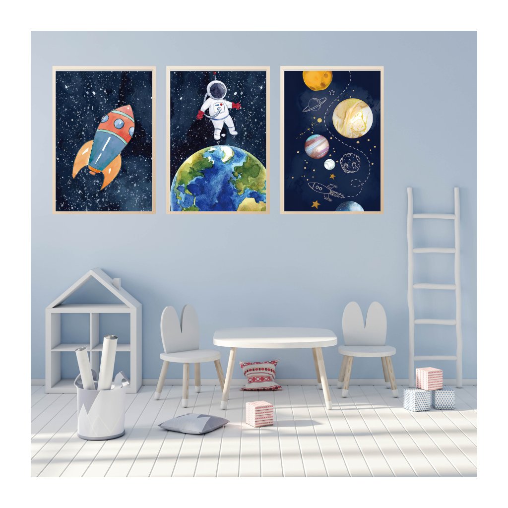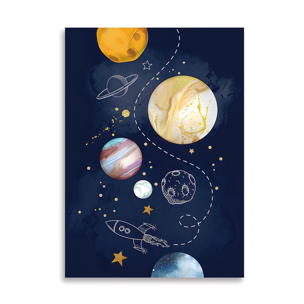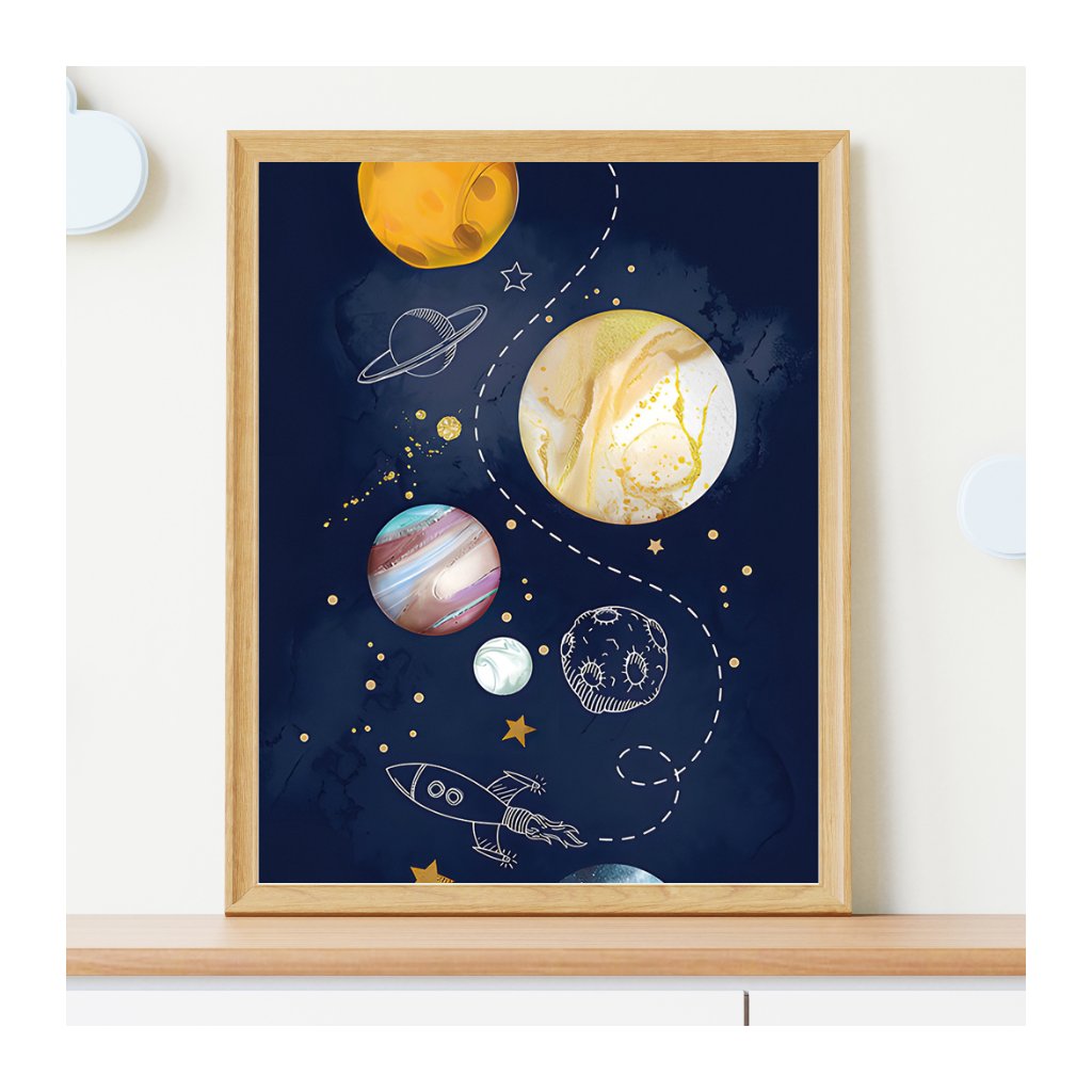 Piękny obraz z motywem planet w kosmosie idealnie sprawdzi się w pokoju dziecięcym, salonie czy sypialni.
